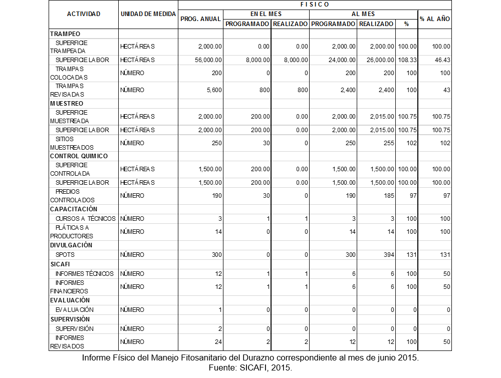 Al mes de junio de 2015, se muestrearon 2000 has para un acumulado de 2,015 hectáreas, con un cumplimiento del 100.75% de avance a la meta anual.