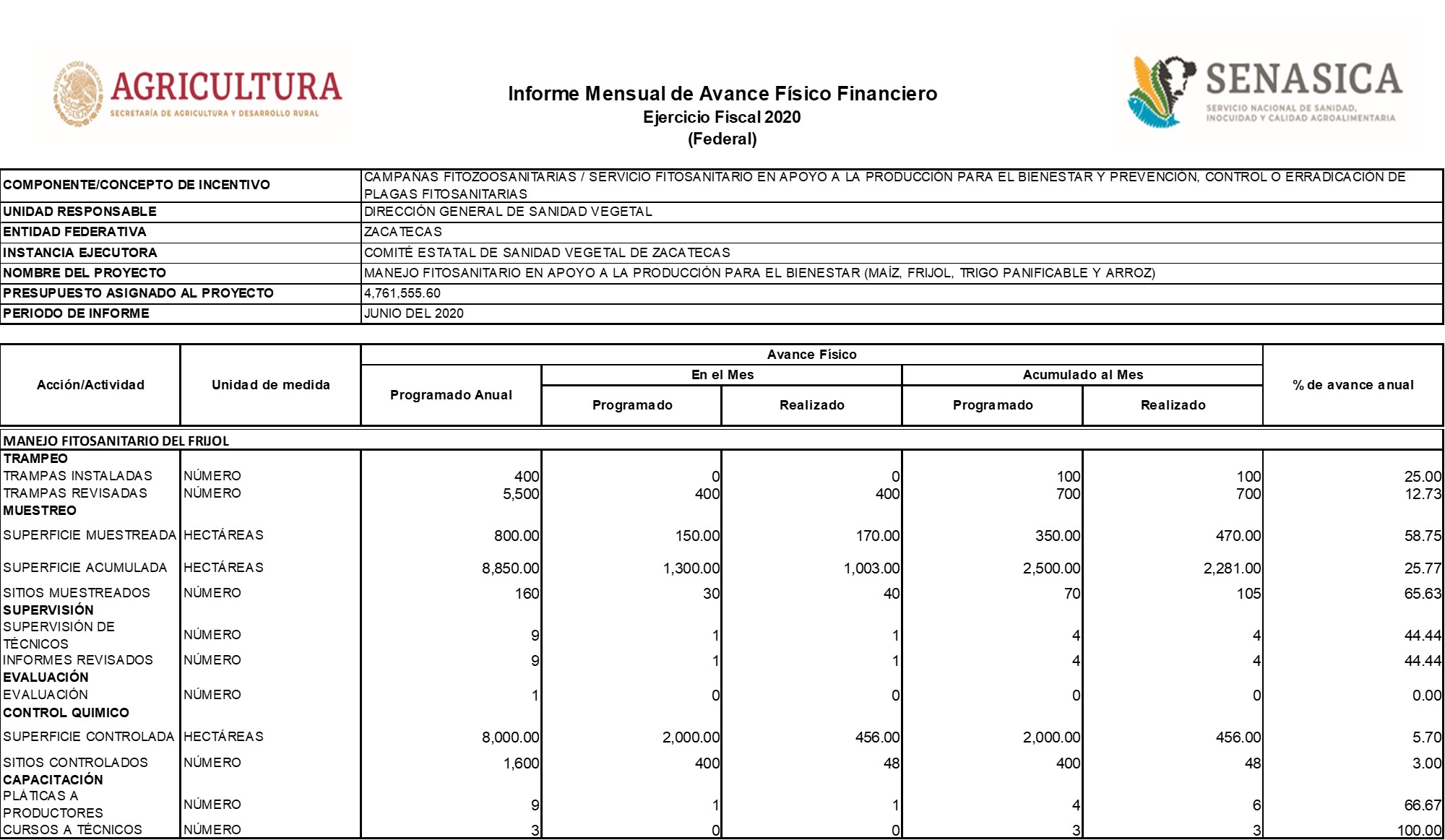 Operar campañas fitosanitarias, con la finalidad de realizar el control y en su caso, la erradicación de plagas y enfermedades que afectan a la producción agrícola, para conservar y mejorar el estatus fitosanitario de plagas que afectan al maíz, frijol, trigo panificable, cítricos, ciruela, durazno, guayaba, lima, limón, mango, manzana, membrillo y perón.