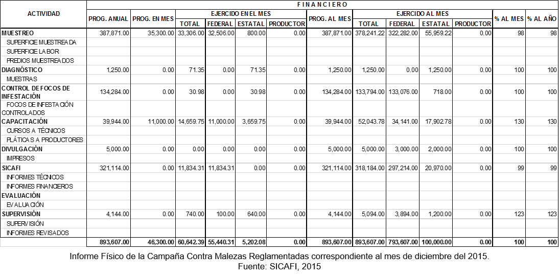 Nota: Durante 2014 se muestrearon 2,510 hectáreas para Polygonum convolvulus, 2,197 hectáreas para Cuscuta spp. L. Para 2015 en el calendario de metas se programó muestrear 1,600 hectáreas para estas dos malezas.