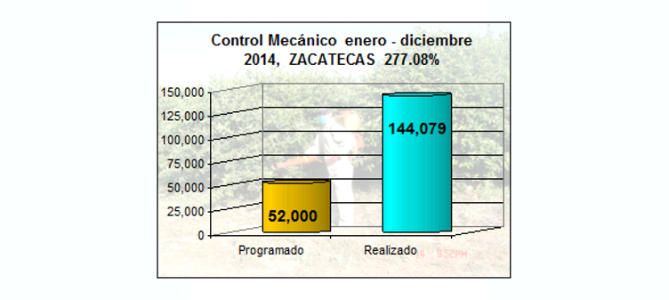 Control Mecánico: La meta para este rubro fue superior a lo programado, porque en el Programa de Trabajo no se tiene cuantificada la Zona Libre, además de que se intensificó esta actividad en la Zona de Baja Prevalencia porque en el área comercial en la región guayabera, se originó una crisis de comercialización.