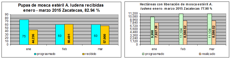 Control Autocida: La cantidad de pupas de moscas recibidas, depende de la producción en la planta. En control Autocida, las hectáreas programadas se realizaron de acuerdo a los bloques de liberación que se tienen; pero por acuerdo con la DGSV, se dejaron de liberar algunos a fin de realizar acciones de control químico – mecánico.