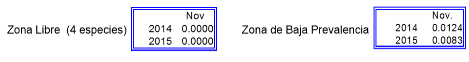 Muestreo: Para la Zona Libre en área marginal se tiene programado durante todo el año, mientras que para el área comercial es de marzo a octubre. Para la Zona de Baja Prevalencia se genera durante todo el año en base a los cuadrantes de zona de liberación de mosca estéril, así como en áreas comerciales.